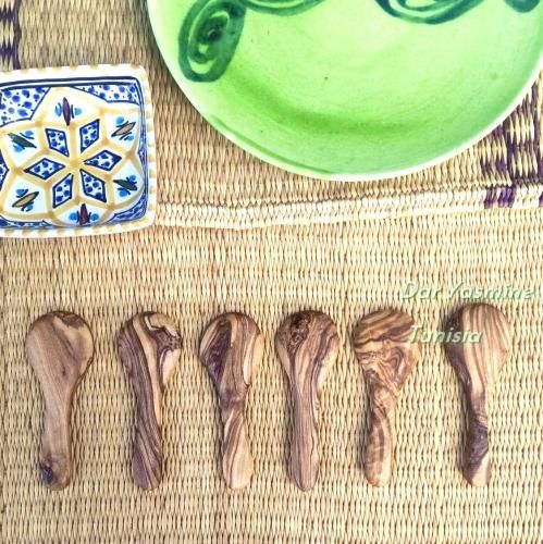 チュニジアならではの木目のすばらしい、樹齢300-800年の木が用いられます。オリーブの実を食し、オイルを生むため、生産性のある木は法律上許可がない限り伐採はできません。