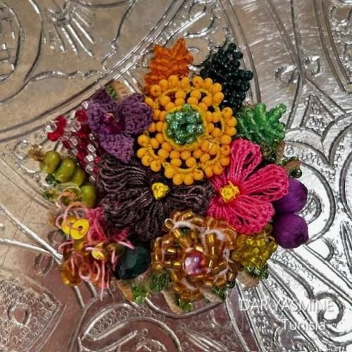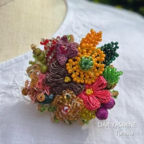 色鮮やかなお花に様々なビーズや天然石などをちりばめた色鮮やかなブローチ