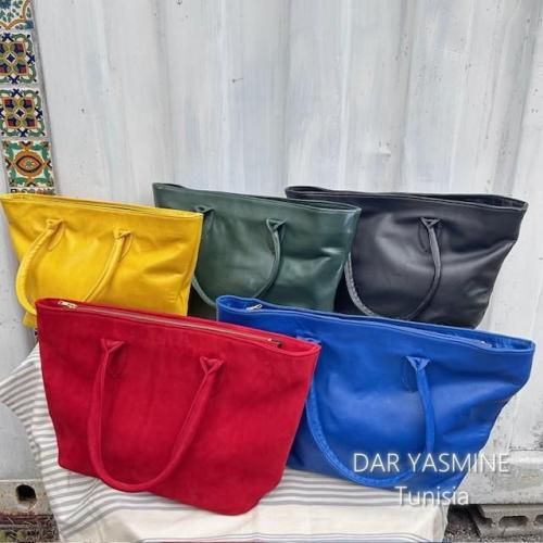 チュニジア地中海沿岸のモナスティール県にある小さな革工房にて、ハエルディーンさんの親戚たちがかばんやポーチ、スリッパなどをつくっています。