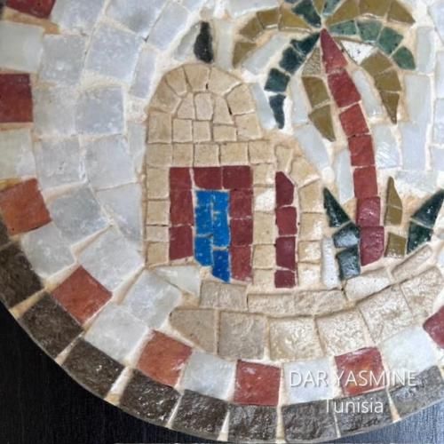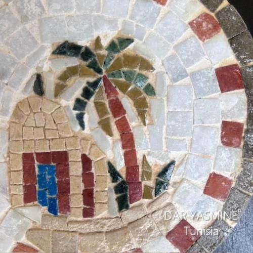*こちらのモザイク画のモチーフはサハラにおけるなつめやしの木のオアシスとマラブです。